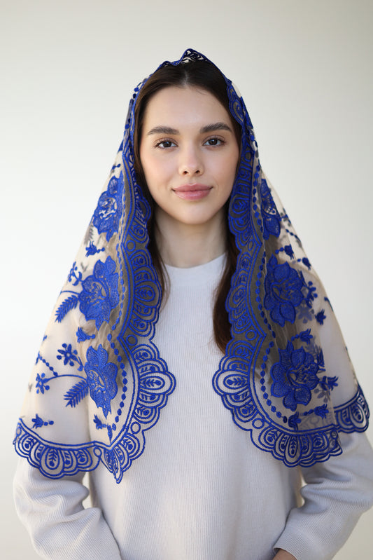 LONG VEIL WITH BLUE FLOWERS