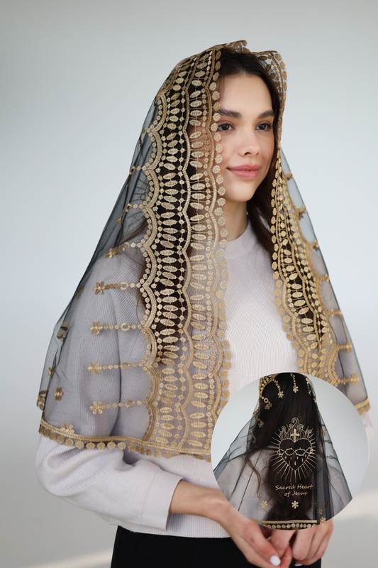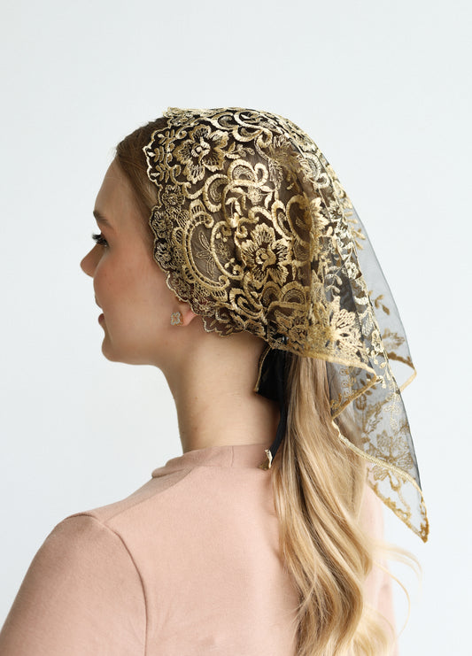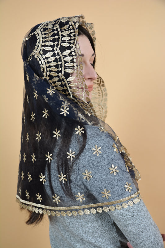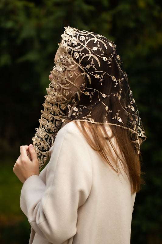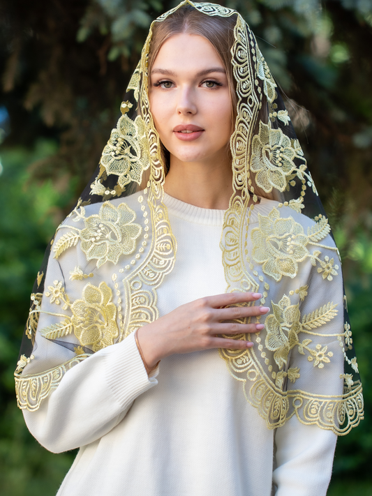 Gold chapel veil with floral embroidery