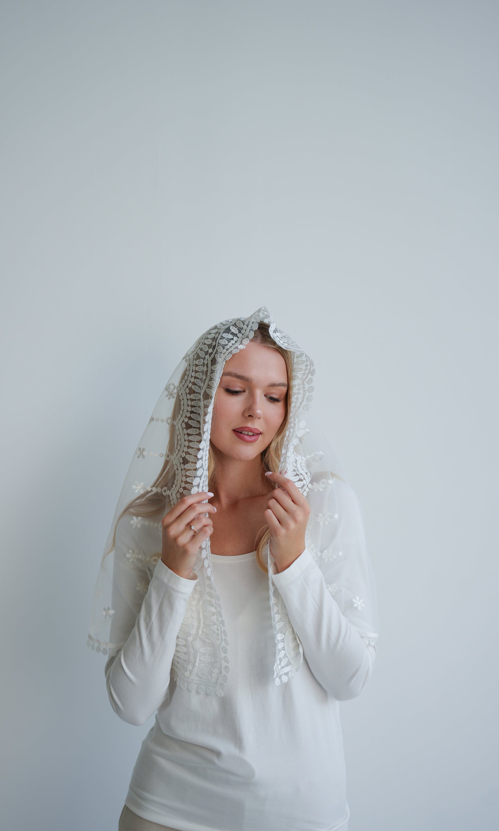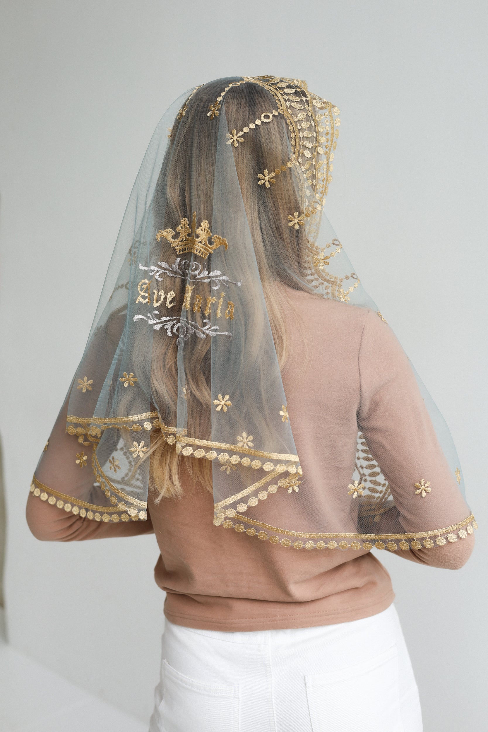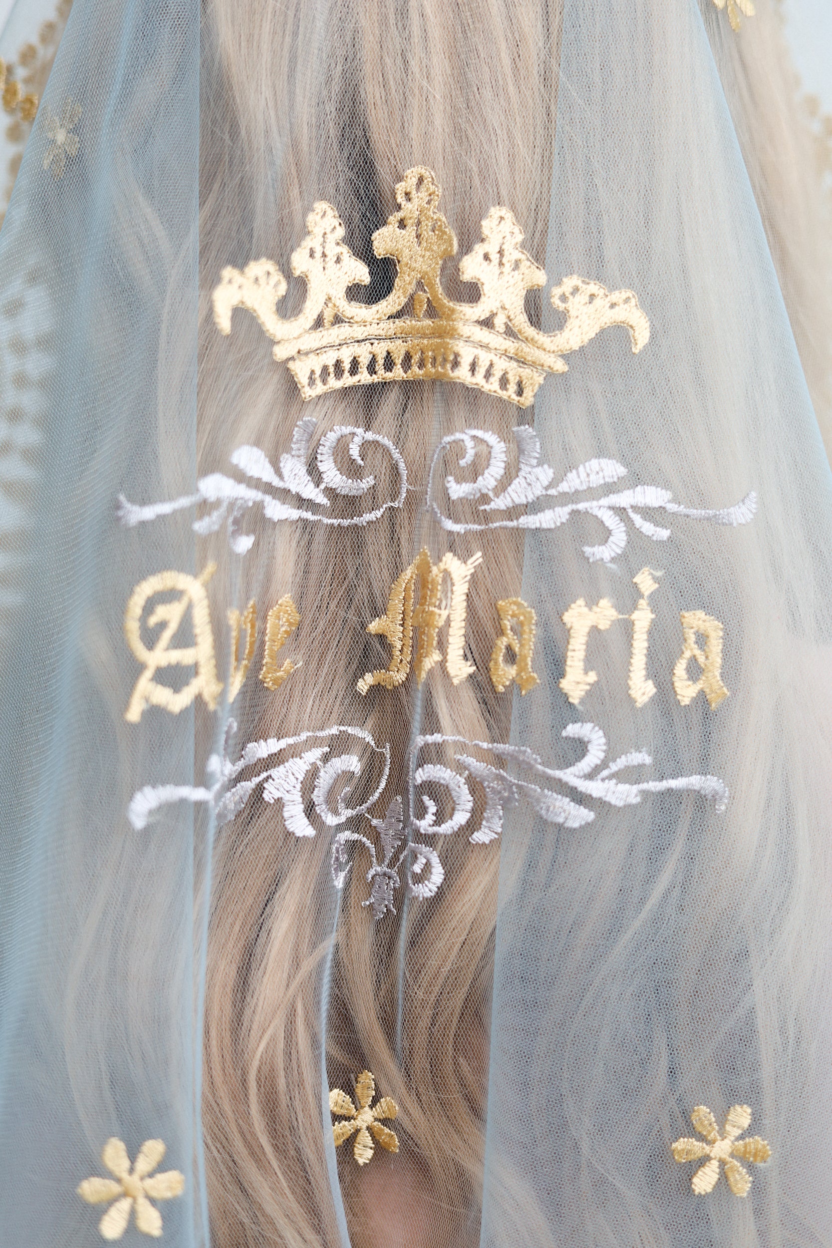 - Long Mantilla with fossil tulle & Ave Maria Embroidery